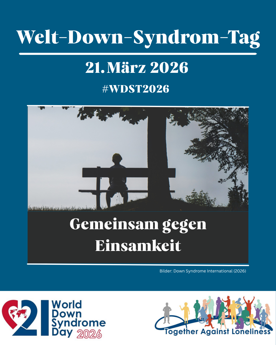 Wir alle können gemeinsam gegen Einsamkeit vorgehen und einen Unterschied im Alltag machen. Lächle jemanden an, komm ins Gespräch, sag jemandem, wie schön es ist, dass es ihn*sie gibt. Bildquellen: Down Syndrome International (2026). About the 2026 theme. worlddownsyndromeday. https://www.worlddownsyndromeday.org/about-the-2026-theme/ Studien: Mencap (2019). People with a learning disability seven times as likely to be lonely this Christmas. https://www.mencap.org.uk/press-release/people-learning-disability-seven-times-likely-be-lonely-christmas Bishop, G. M., Llewellyn, G., Kavanagh, A. M., Badland, H., Bailie, J., Stancliffe, R., Emerson, E., Fortune, N., Aitken, Z. (2024). Disability-related inequalities in the prevalence of loneliness across the lifespan: trends from Australia, 2003 to 2020. BMS Public Health 24 (621). https://doi.org/10.1186/s12889-024-17936-w |