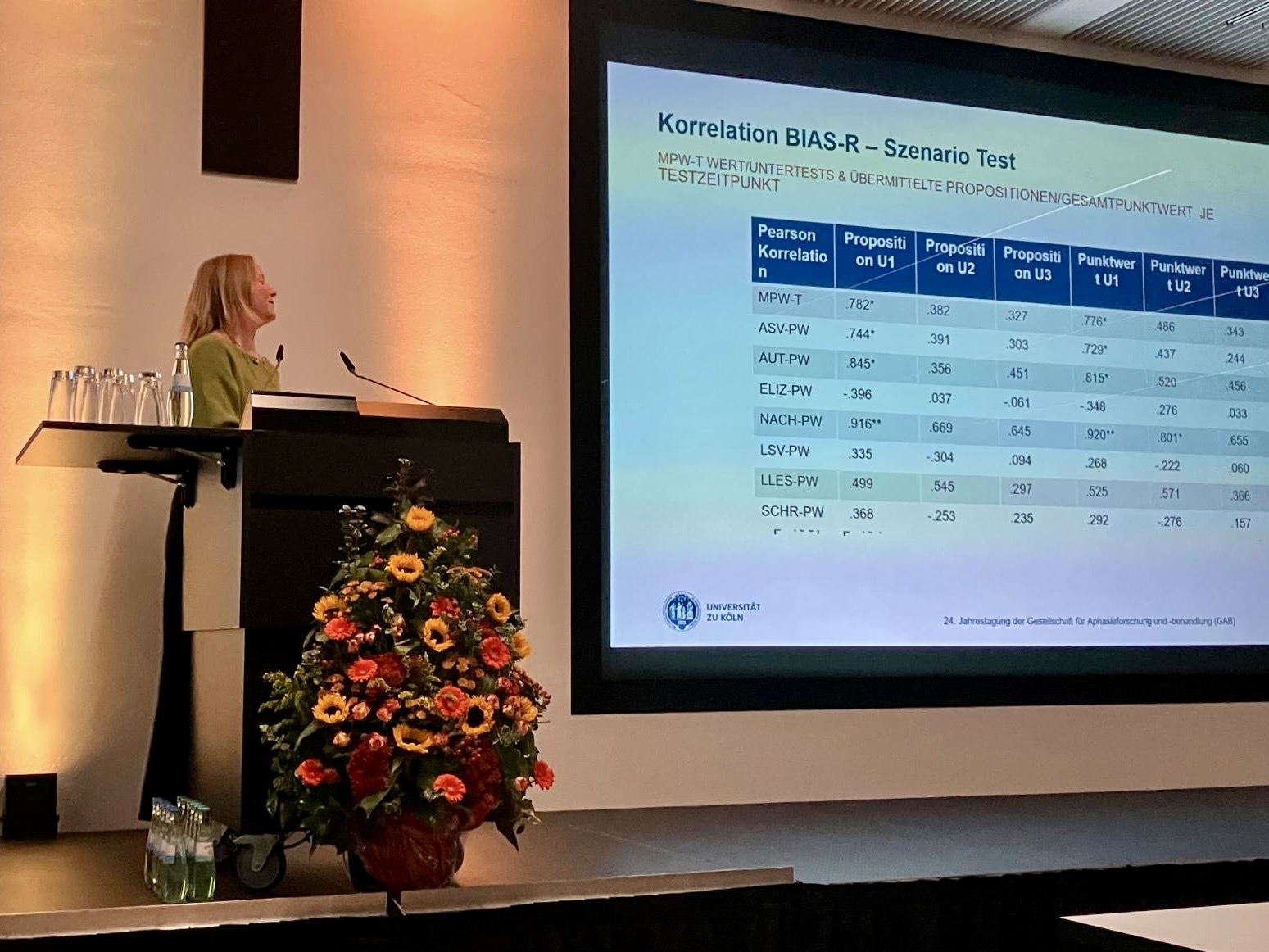 Im Zuge der 23. Jahrestagung der „Gesellschaft für Aphasieforschung und -behandlung“ (GAB), die vom 14. bis zum 16.11.2024 stattgefunden hat, fuhr ein Teil des Lehrstuhlteams nach Leipzig. Unter dem Motto ‚„Leipzig mit Allerlei“ - Kognition, Outcome-Prädiktion und weitere Zutaten für eine effiziente Sprachtherapie‘ wurden vielseitige Workshops angeboten, spannende Poster präsentiert und Vorträge zu aktuellen wissenschaftlichen Themen gehalten. Zu den Vortragenden gehörten u. a. Dr. Jana Quinting mit einem Beitrag zu „Sozial-kognitive[n] Fähigkeiten in alltagsnahen Kommunikationssituationen bei Personen mit Schädel-Hirn-Trauma“ (Quinting, Sollberger, Jonas, Stenneken). Dr. Ilona Rubi-Fessen stellte aktuelle Studienergebnisse zum Thema „Individualisierte nicht-invasive Hirnstimulation bei früher postakuter Aphasie und deren Einfluss auf sprachliche und kommunikativ-pragmatische Fähigkeiten. Eine Beobachtungsstudie“ (Rubi-Fessen, Gerbershagen, Stenneken, Willmes) vor. Außerdem präsentierten Dr. Lisa Gerhards und Dr. Ilona Rubi-Fessen ein Poster mit dem Namen: „Die Kölner LeseListen: Eine sprach-statistisch und linguistisch kontrollierte Diagnostik erworbener Dyslexien“ (Gerhards, Rubi-Fessen, Weinzierl, Stenneken). |