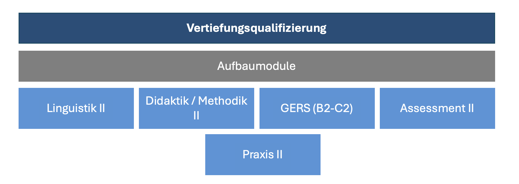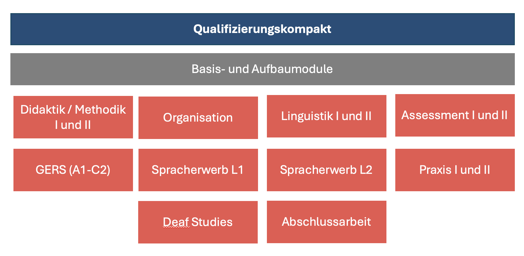 Die Qualifizierung gliedert sich in zwei Bereiche auf: Qualifizierungskompakt und Vertiefungsqualifizierung. Das Qualifizierungskompakt umfasst 10 Module und läuft über drei Jahre, die Vertiefungsqualifizierung besteht aus 4 Modulen und läuft über zwei Jahre. Beide Bereiche orientieren sich am Gemeinsamen Europäischen Referenzrahmen für Sprachen (GERS), bzw. GERS-DGS, und beinhalten Theorie und Praxis. Die Praxismodule bieten die Möglichkeit zur Hospitation und zur eigenen Unterrichtsdurchführung.