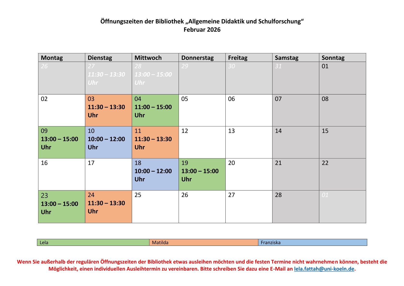 oder unter der Mail-Adresse fachbibliothek-didaktik-schulforschung@uni-koeln.de erreichbar.