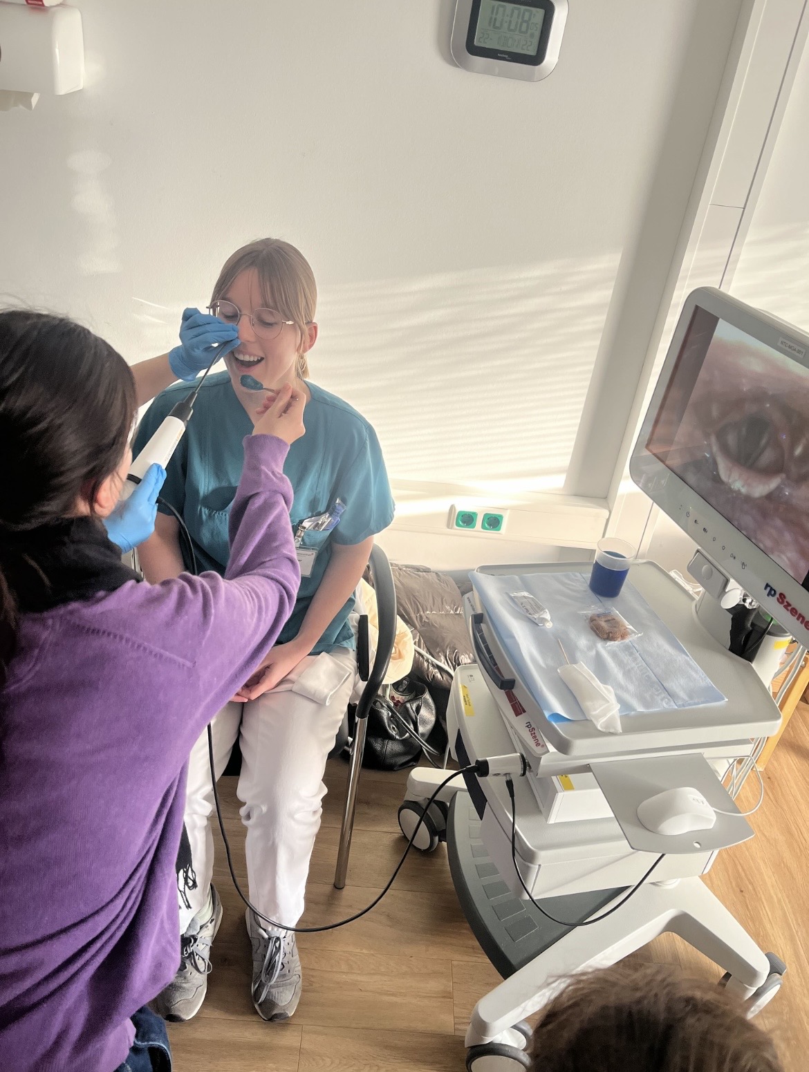 Am 22. und am 29. Januar 2026 besuchten Studierende des fünften Semesters im Rahmen des Praxiskurs II – Sprach- und Schlucktherapie bei Demenz die Demenzstation des Cellitinnen Krankenhaus St. Marien. Nach einer Einführung arbeiteten die Studierenden in Kleingruppen mit Personen mit Demenz nach den Prinzipien der Biografiearbeit. Danach konnte die Studierenden eine FEES (Fiberoptic Endoscopic Evaluation of Swallowing, s. Foto) bei ihrer Dozentin Mareike Naber beobachten und Fragen dazu stellen. Der Besuch der Demenzstation bildete damit den praktischen Teil der zuvor im Seminar gelernten Grundlagen.