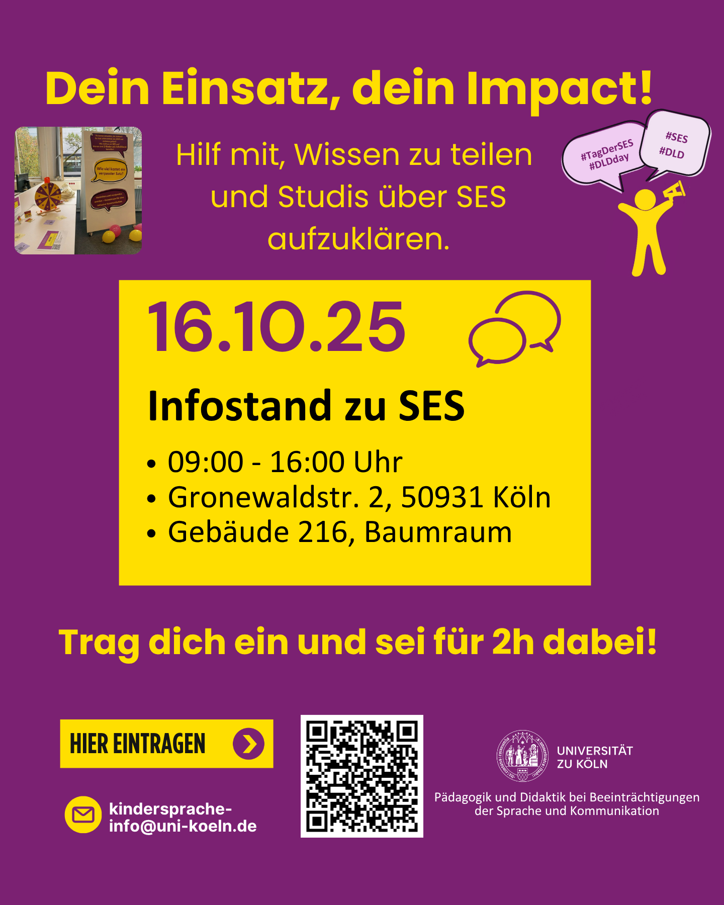 Am Donnerstag, den 17.10.2024, haben wir an unserem Infostand zum Tag der SES in der Humanwissenschaftlichen Fakultät auf Sprachentwicklungsstörungen aufmerksam gemacht. Neben vielen nützlichen Informationen, Videos und Plakaten konnten interessierte Besucher:innen ihr Wissen im SES-Quiz testen und am Glücksrad tolle Preise gewinnen.