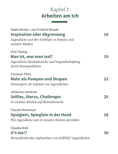 - Im Magazin "Schüler:innen" mit dem Schwerpunktthema „Identität“ ist ein Beitrag von Nadia Wester und Dr. Jan Bossek mit dem Titel „Inspiration oder Abgrenzung. Jugendliche und ihre Vorbilder in Familie und sozialen Medien“ erschienen