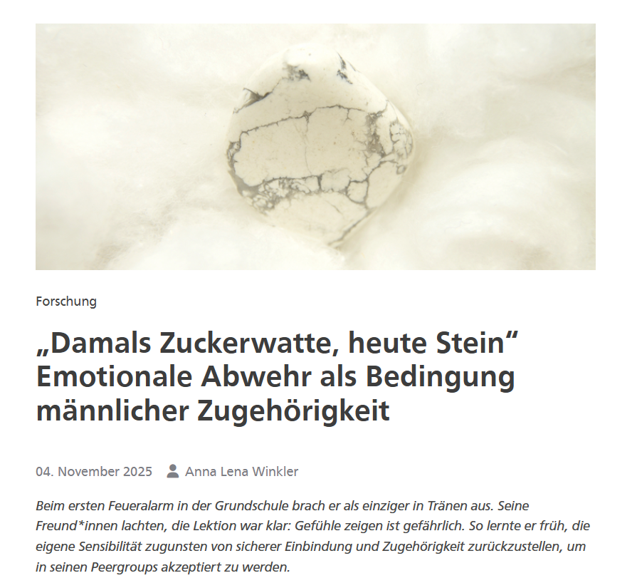 Auf dem blog interdisziplinäre Geschlechterforschung ist ein Beitrag von Anna Lena Winkler zum Thema „Damals Zuckerwatte, heute Stein - Emotionale Abwehr als Bedingung männlicher Zugehörigkeit" erschienen (online verfügbar unter: gender-blog.de/beitrag/damals-zuckerwatte-heute-stein)