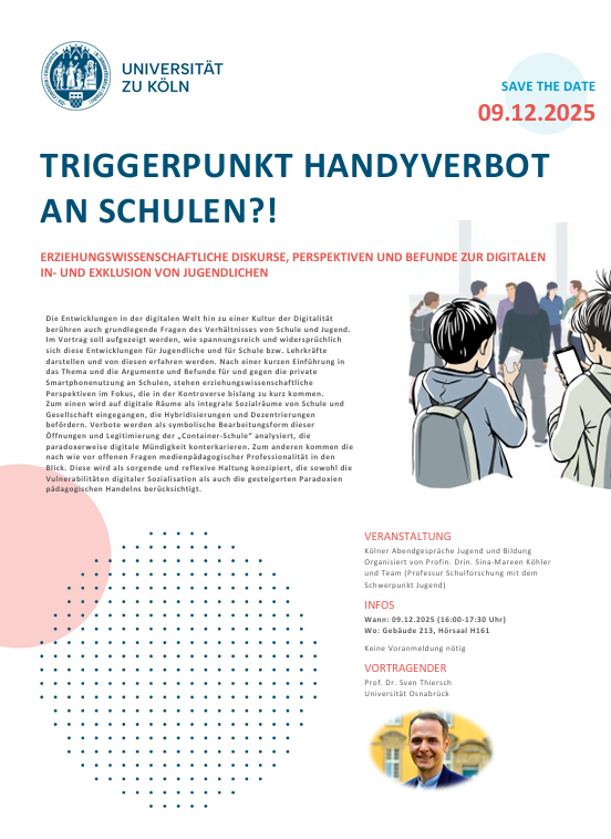 - 09.12.2025: Prof. Sven Thiersch (Universität Osnabrück) zum Thema "Triggerpunkt Handyverbot an Schulen?! - Erziehungswissenschaftliche Diskurse, Perspektiven und Befunde zur digitalen In- und Exklusion von Jugendlichen"